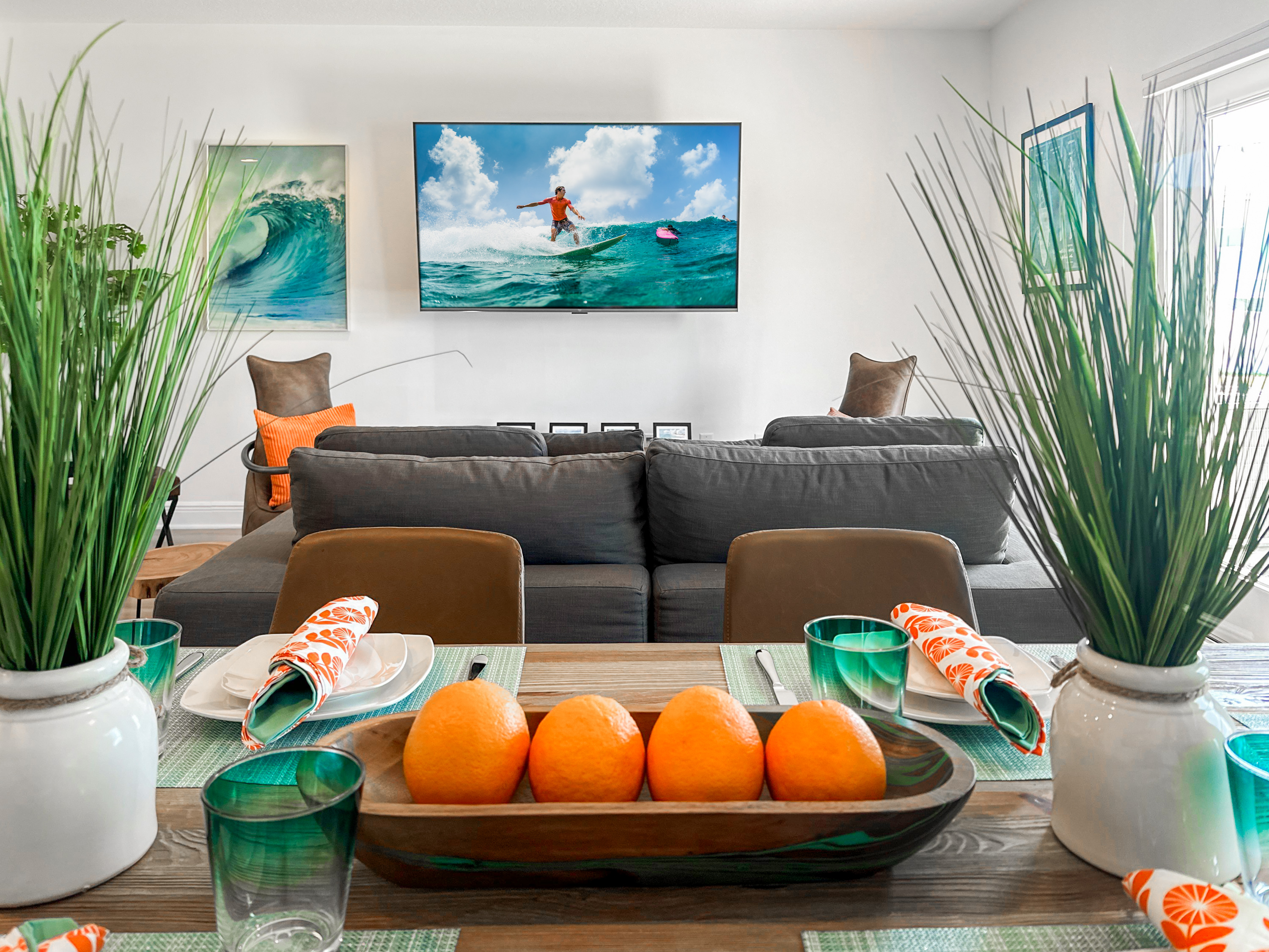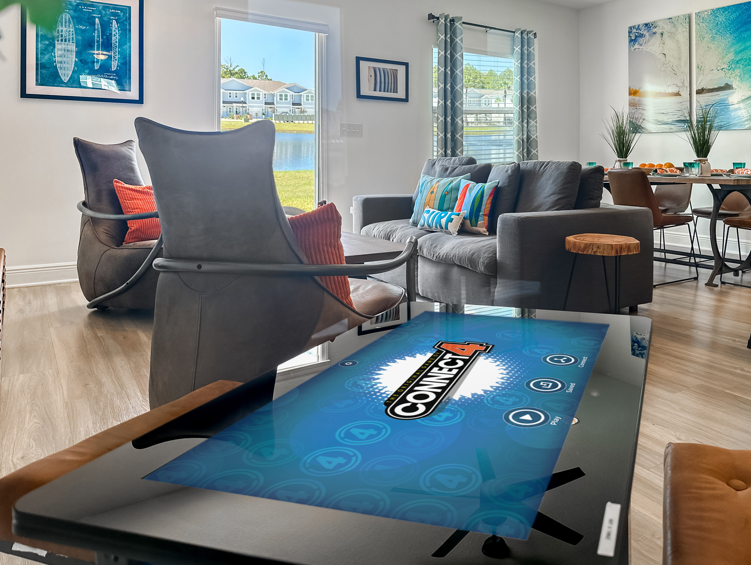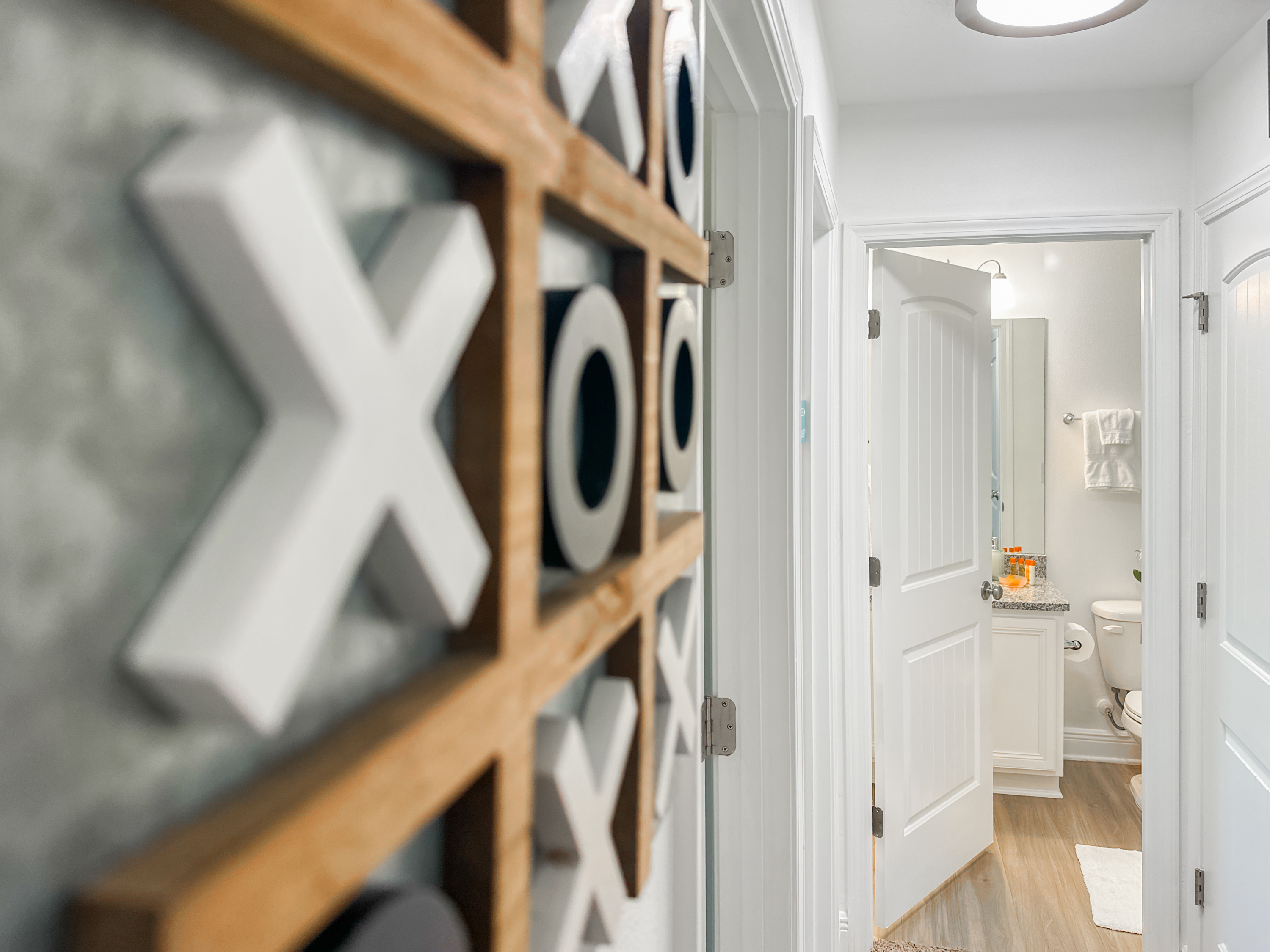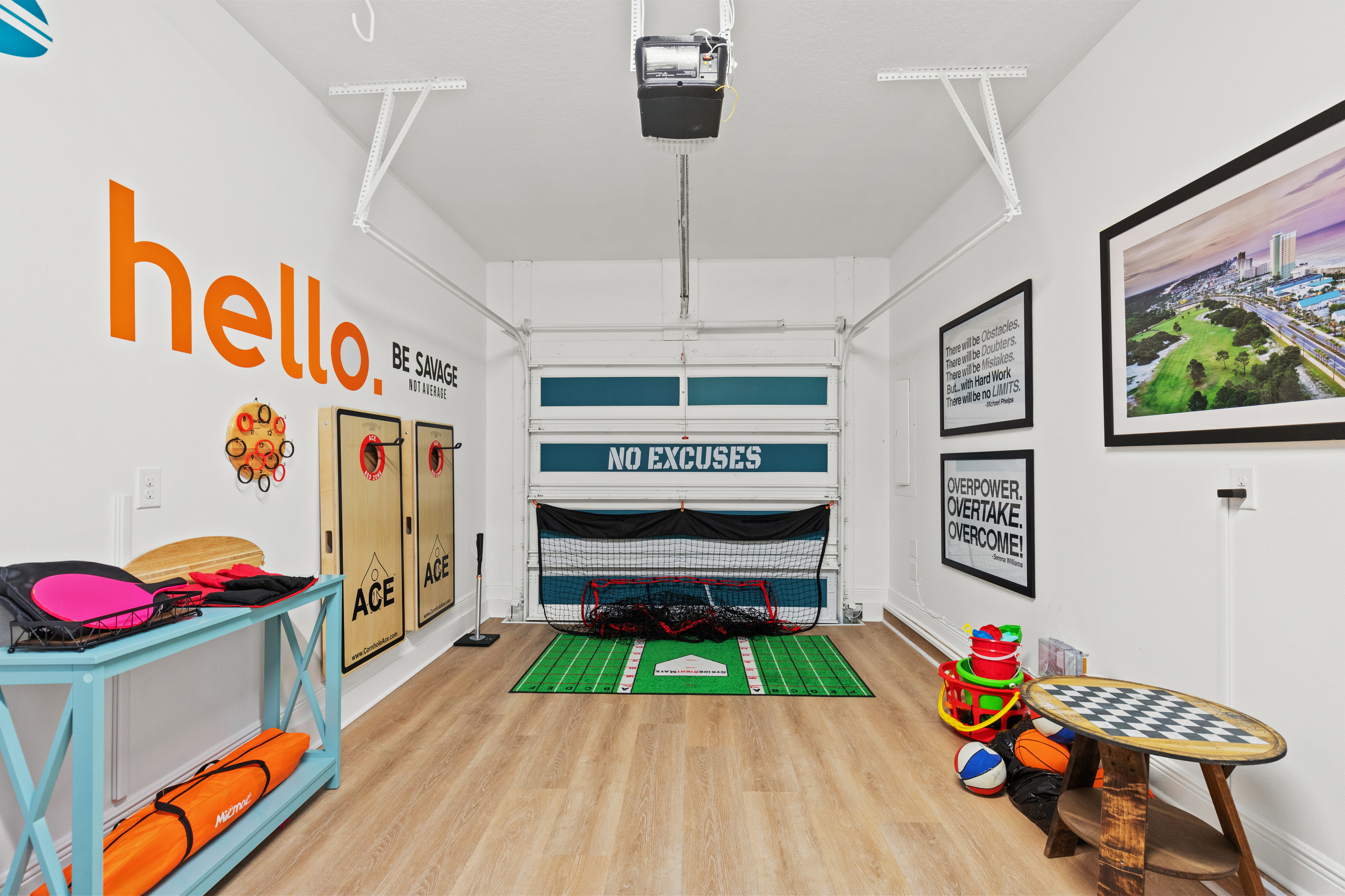Washer and dryer are in the upstairs hallway, complete with an ironing board. The first floor is packed with things to do with the family. Enjoy a movie night on the couch in front of the 80-inch smart TV. Use the Infinity Game Table to facilitate a lively game night. Or play chess, Pictionary, and cornhole! The possibilities are endless!