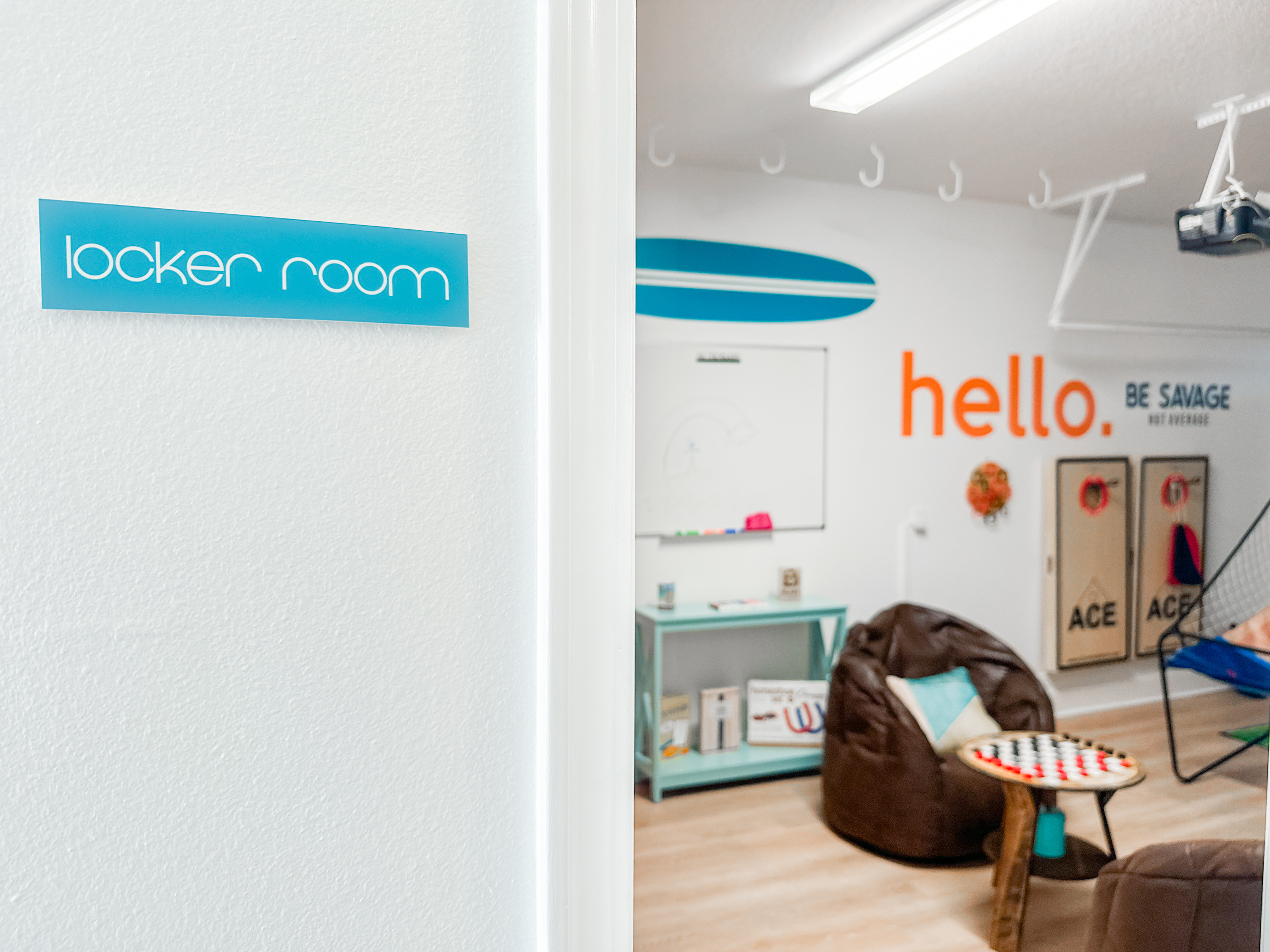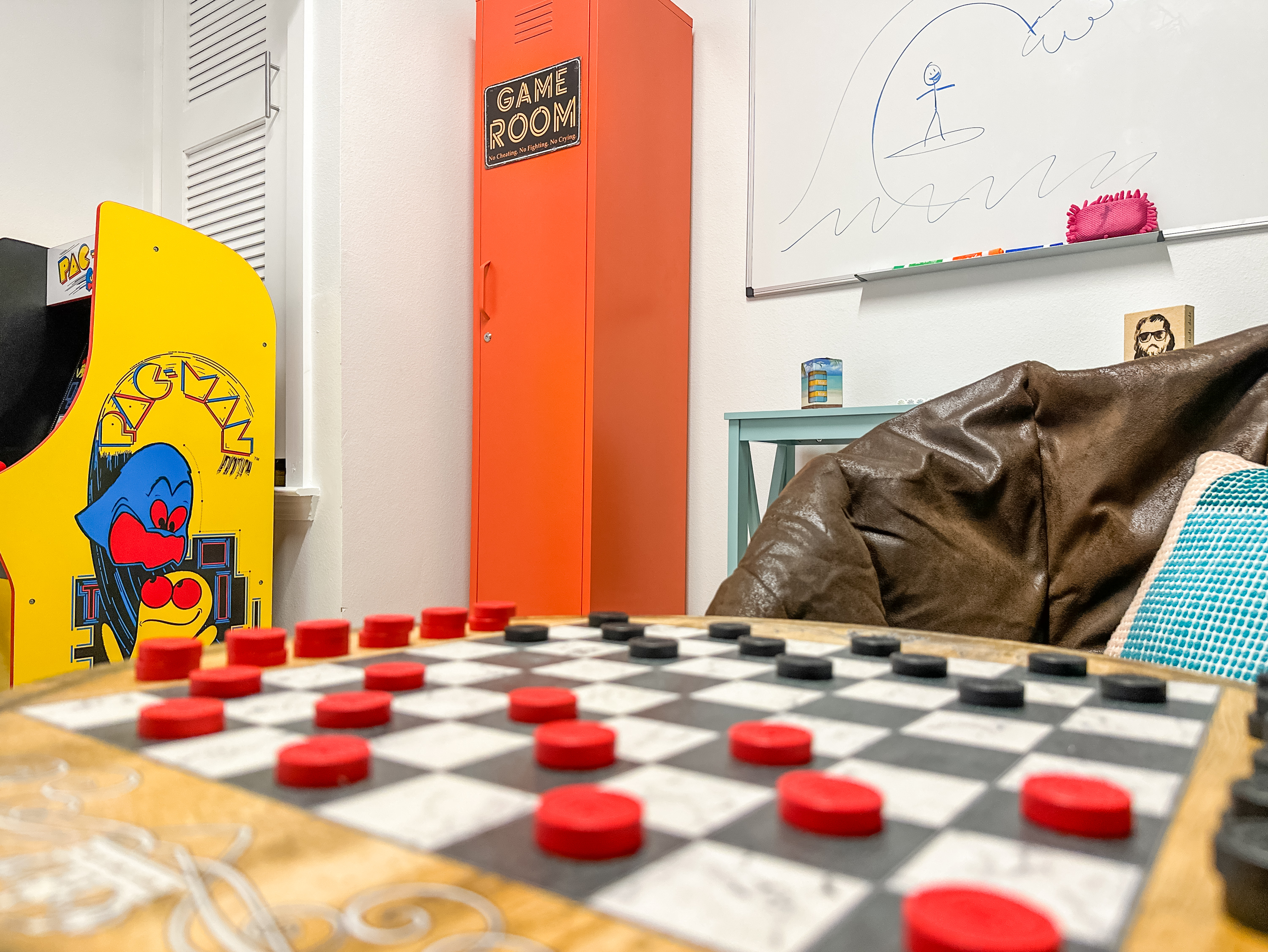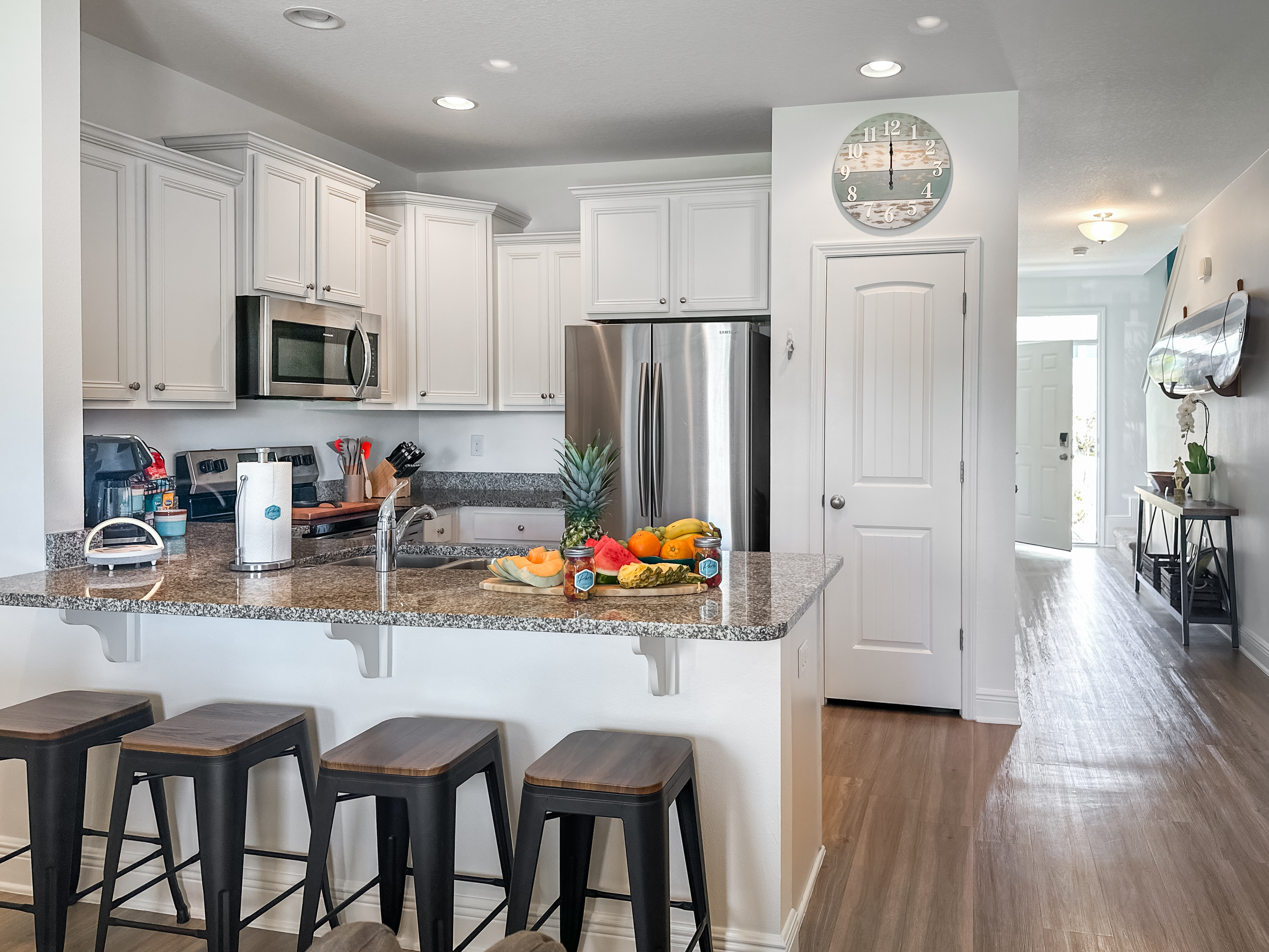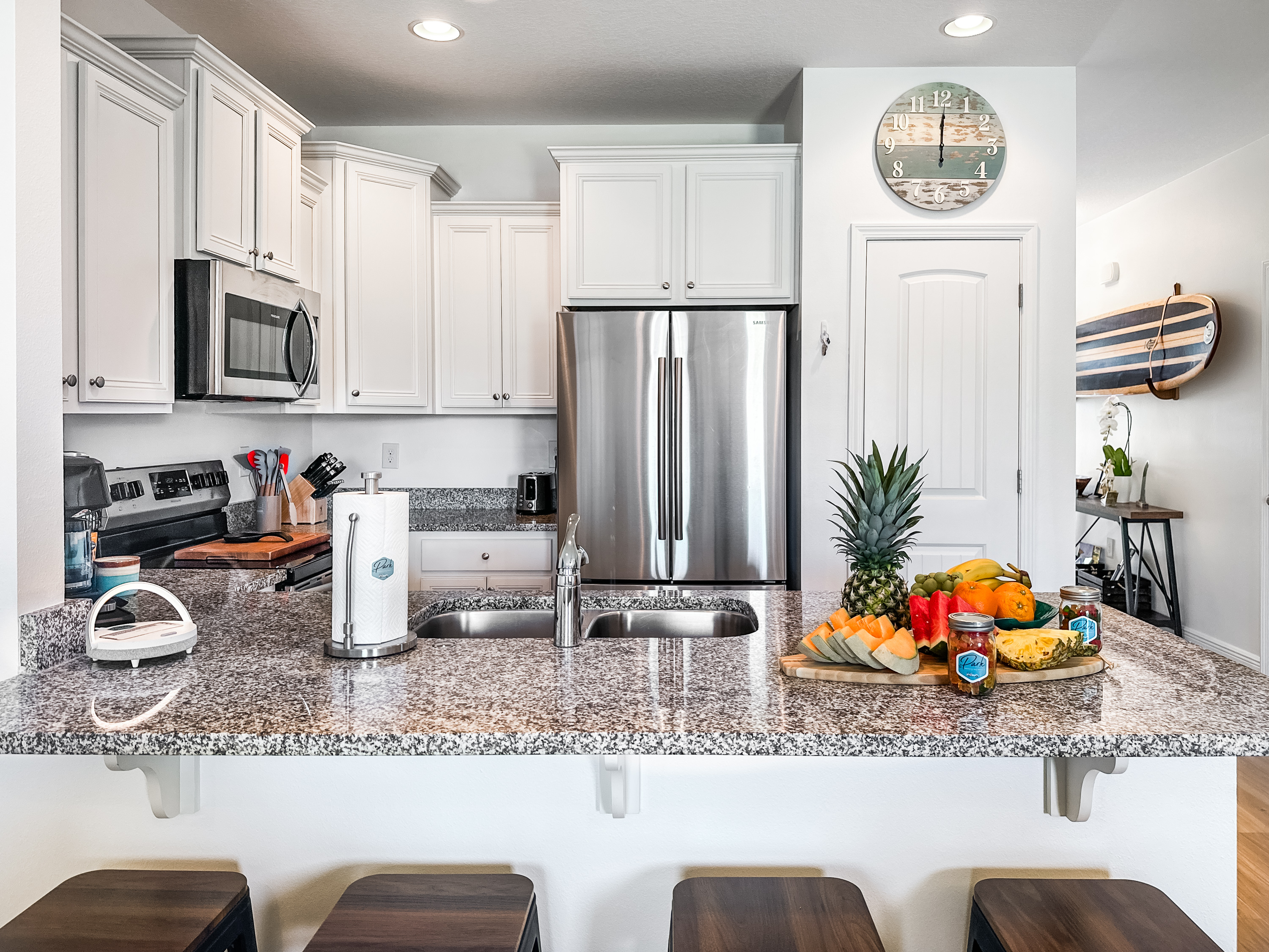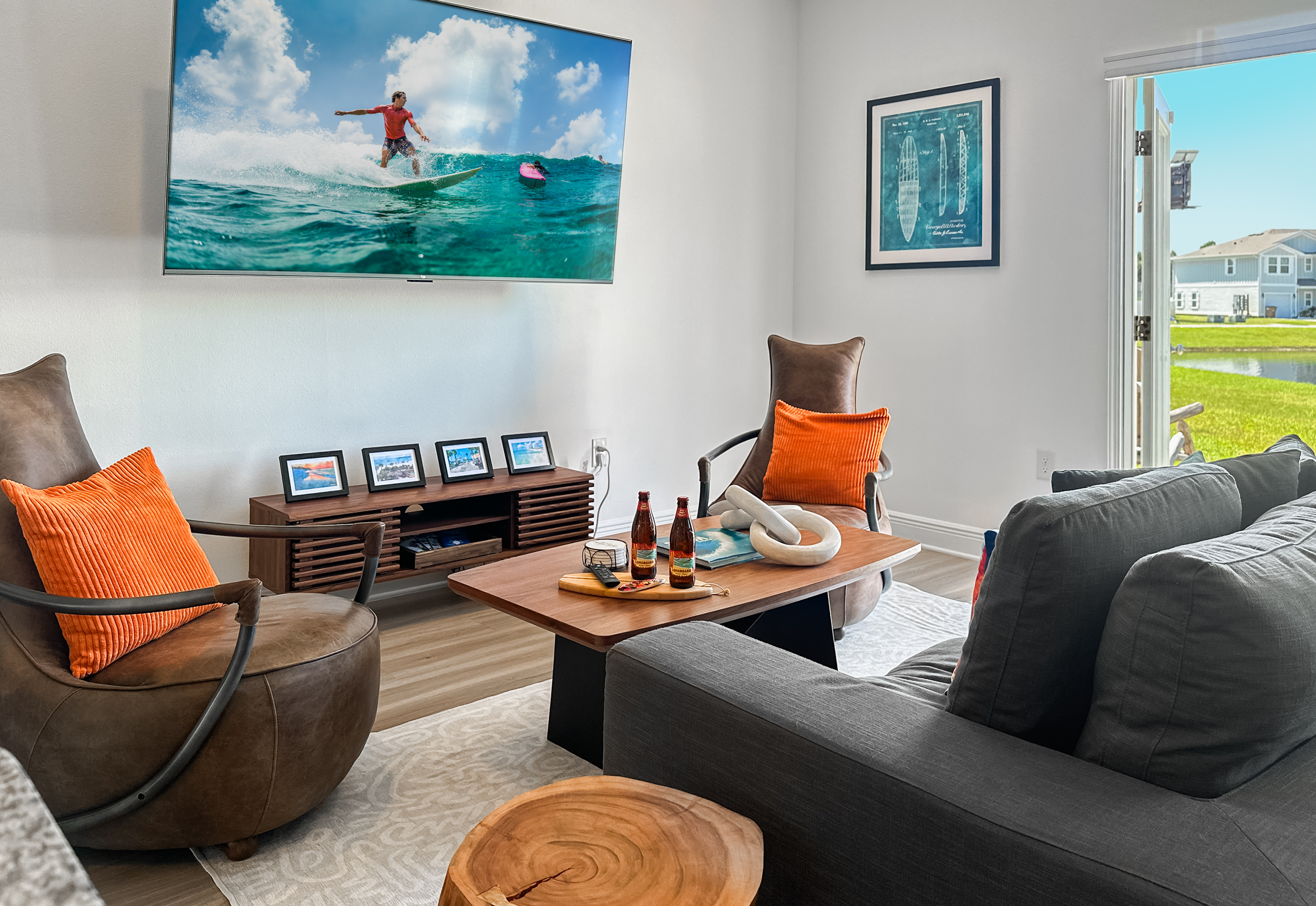Washer and dryer are in the upstairs hallway, complete with an ironing board. The first floor is packed with things to do with the family. Enjoy a movie night on the couch in front of the 80-inch smart TV. Use the Infinity Game Table to facilitate a lively game night. Or play chess, Pictionary, and cornhole! The possibilities are endless!