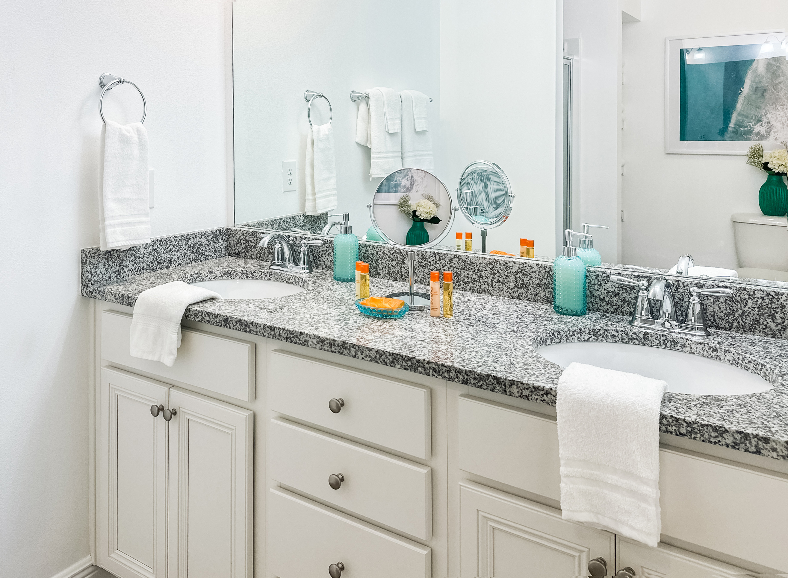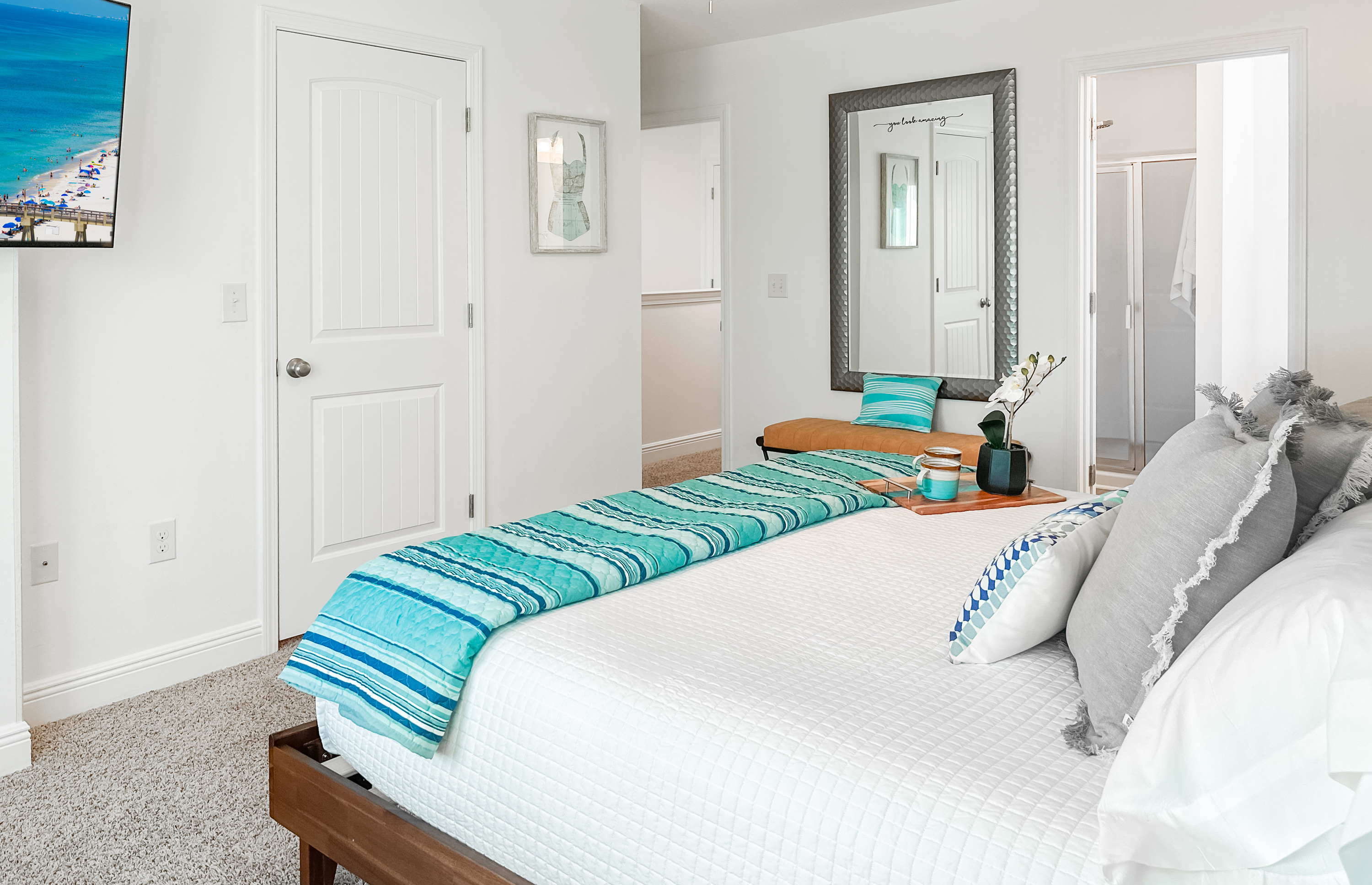 All the bedrooms are situated on the second floor. The master bedroom has an attached bathroom with twin sinks and a glass-walled shower. The other full bathroom (second floor) sports a shower/tub combination. Each of the bedrooms has a flatscreen TV pre-loaded with popular streaming services, only requiring login information. The half bathroom is located on the first floor in the hallway.