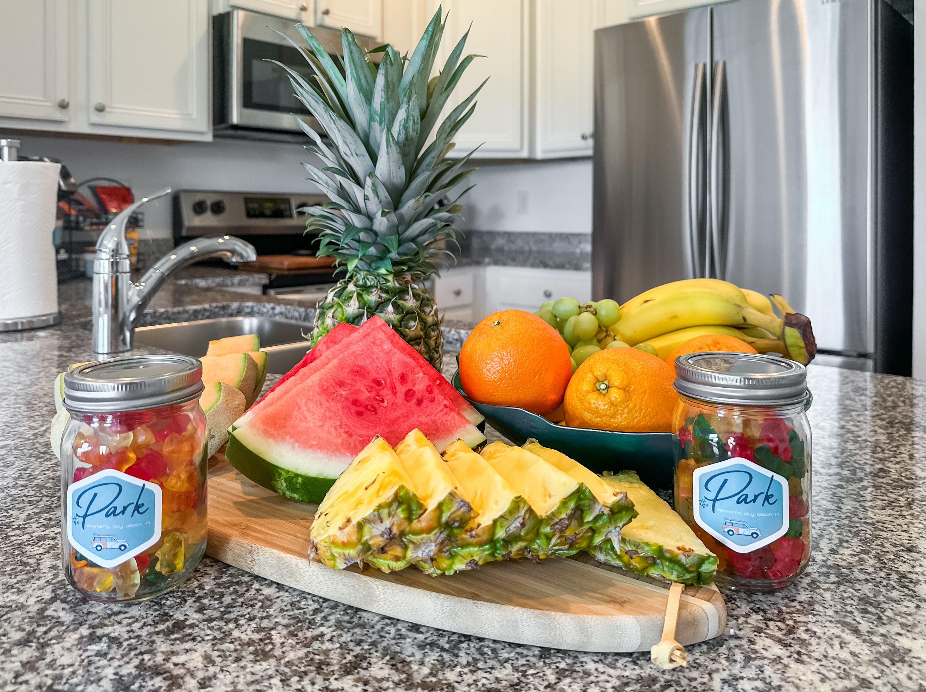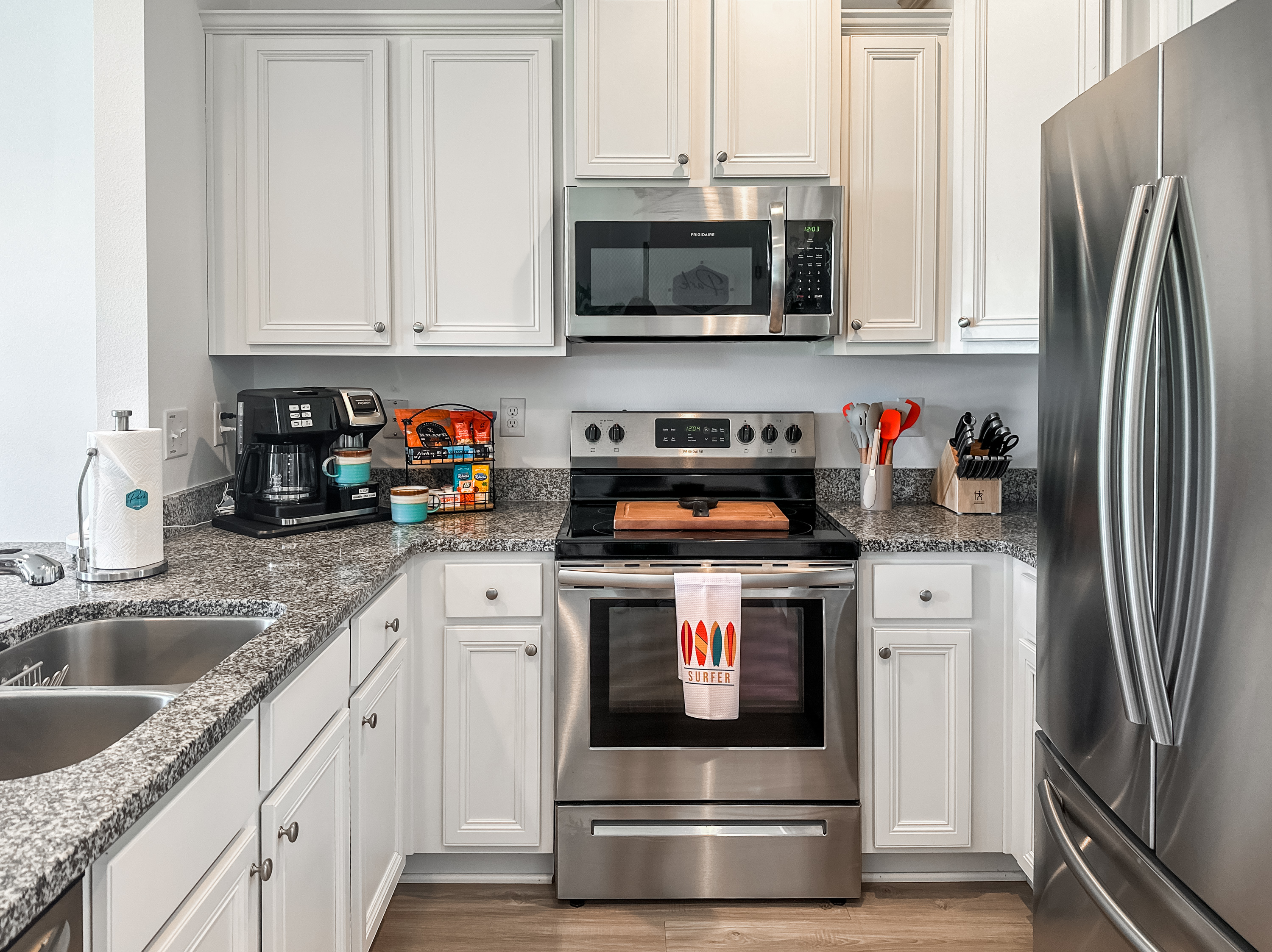 The kitchen has everything needed to make a home-cooked meal or a simple cup of coffee. For each guest, there is a special gift basket filled with coffee, snacks, and treats!